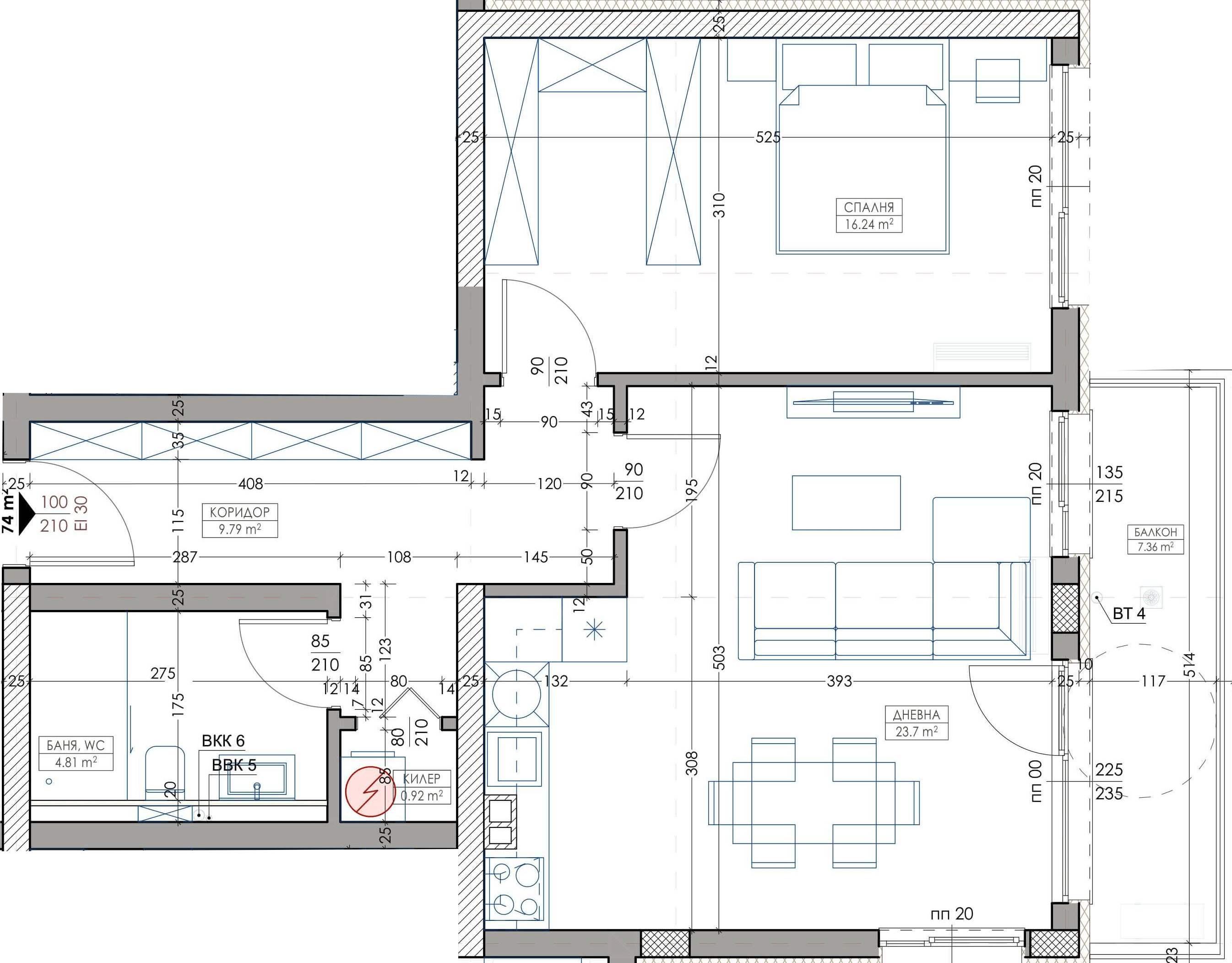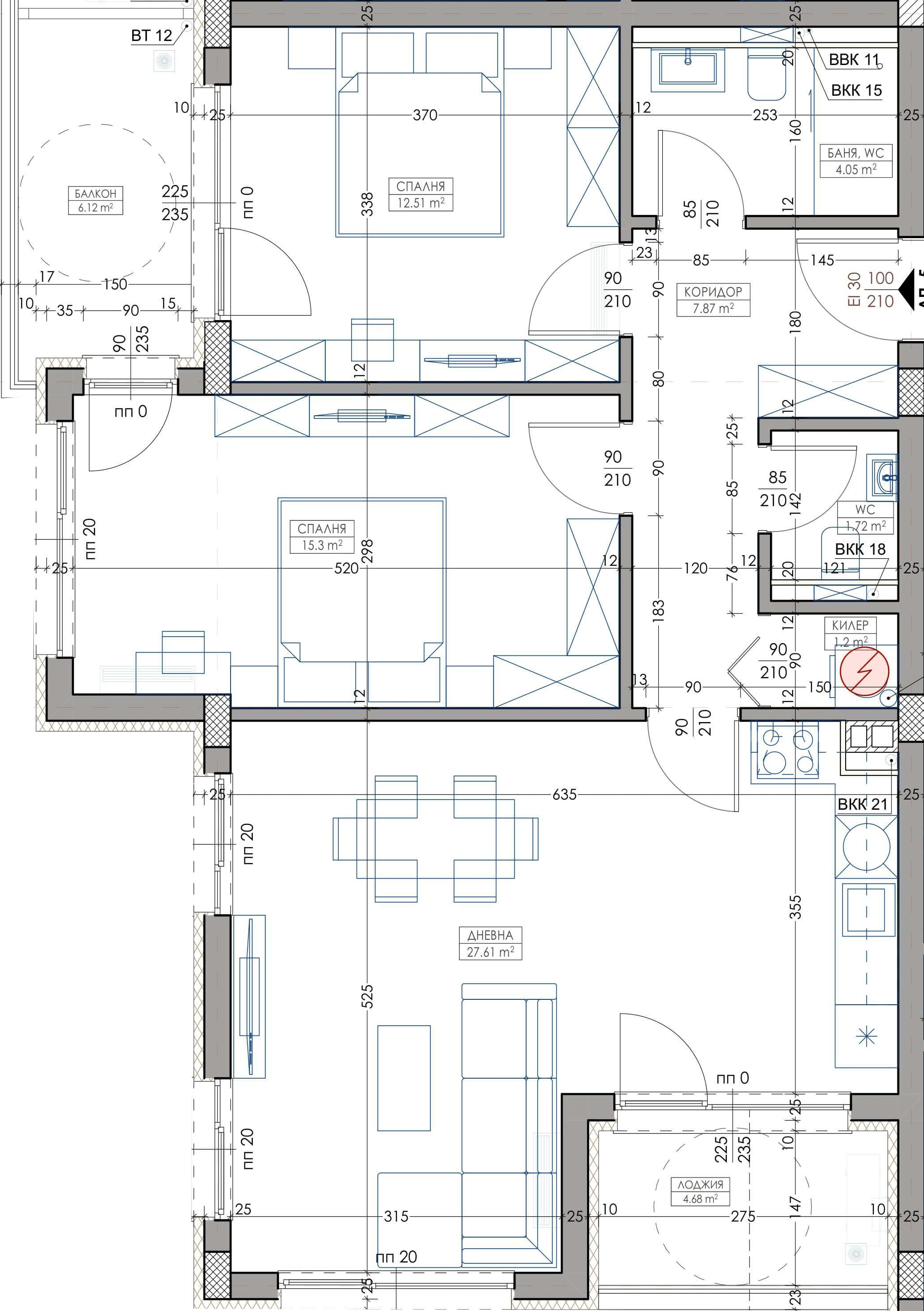 Апартамент – Дневна с кухненски бокс, спалня, баня с тоалетна, килер, входно преддверие, балкон. Имотът е с обща площ 86,48 кв.м, което включва 73,23 кв. м чиста площ и 13,25 кв.м общи части.