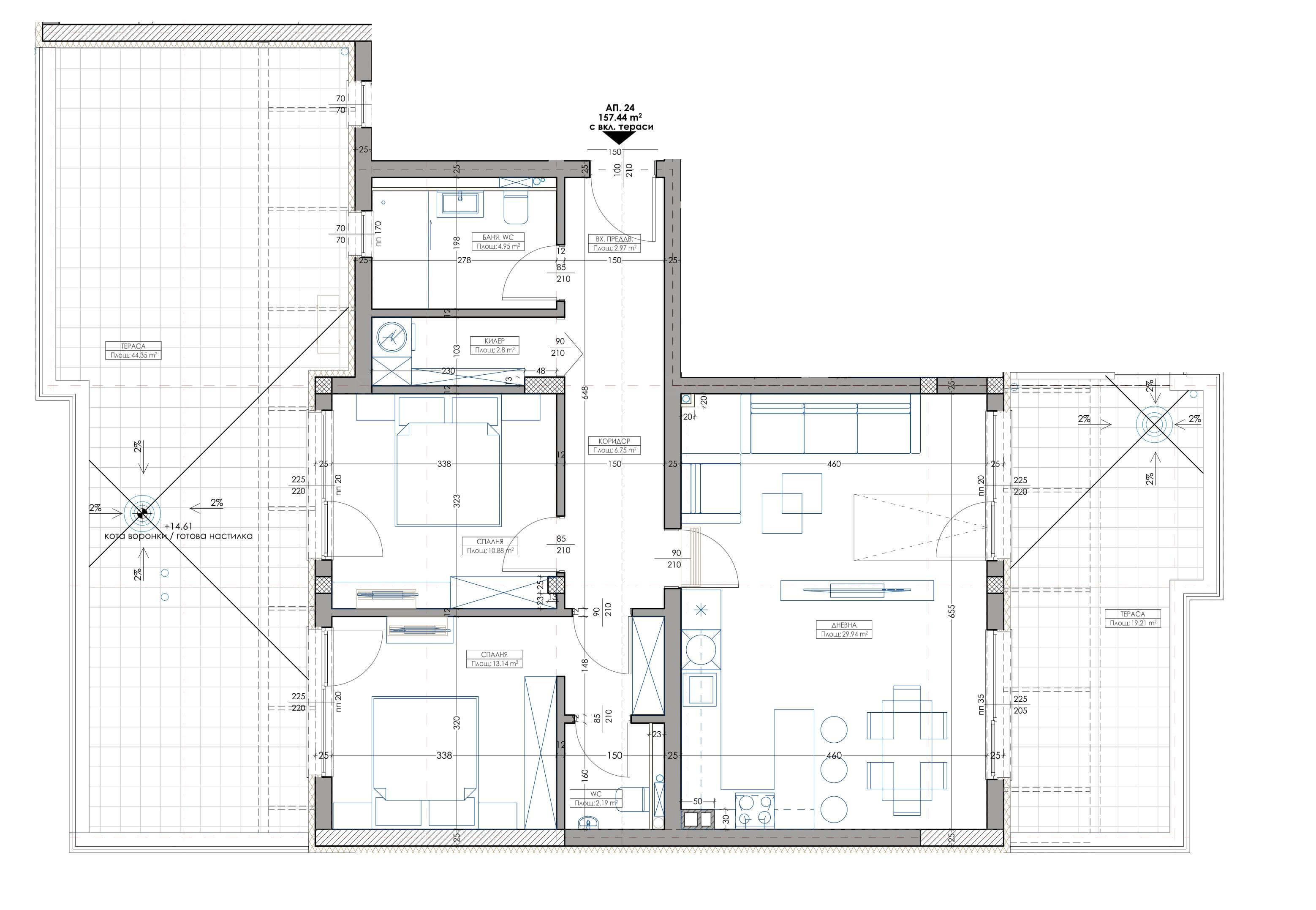 Апартамент – Дневна с кухненски бокс, 2 спални, баня с тоалетна, тоалетна, килер, коридор, входно преддверие, 2 тераси. Имотът е с обща площ 186,11 кв.м, което включва 157,44 кв. м чиста площ и 28,67 кв.м общи части.