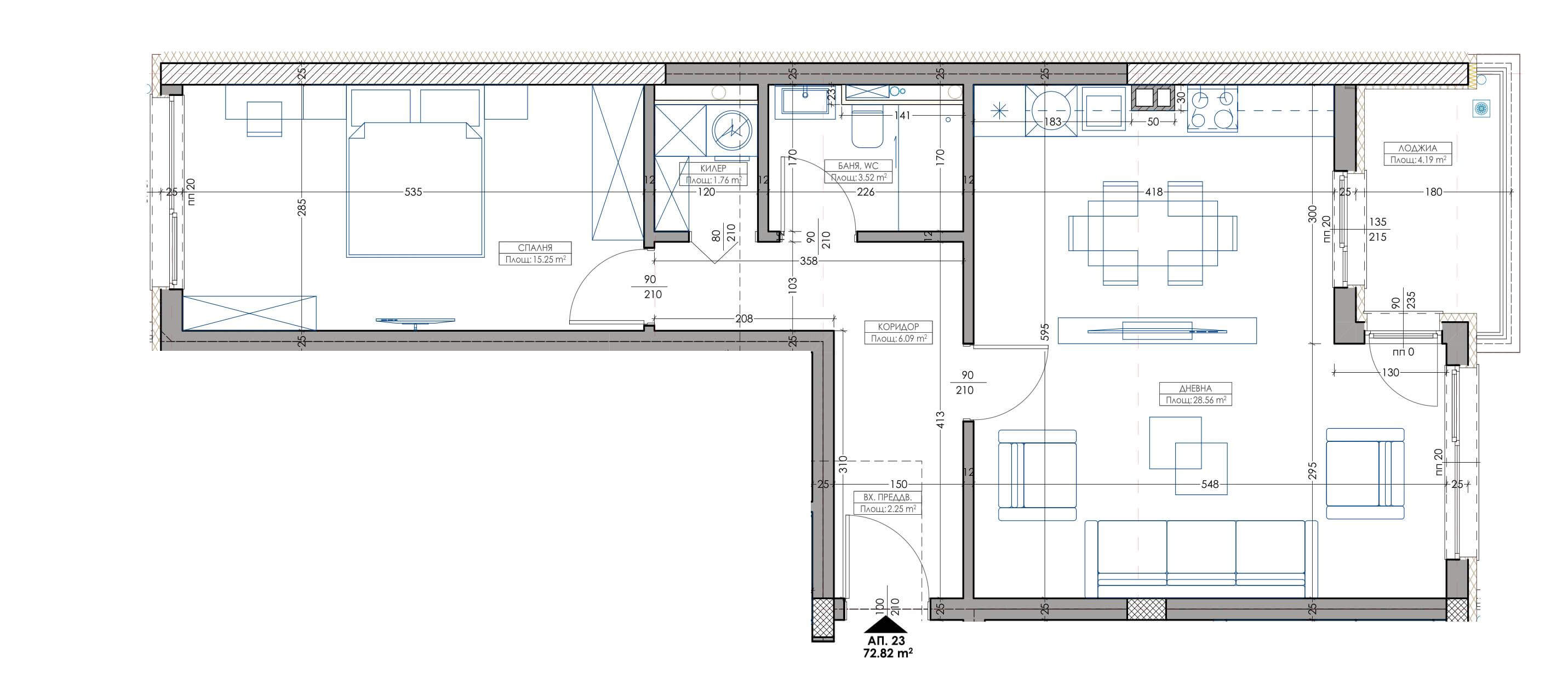 Апартамент – Дневна с кухненски бокс, спалня, баня с тоалетна, килер, коридор, входно преддверие, лоджиа. Имотът е с обща площ 87,20 кв.м, което включва 72,82 кв. м чиста площ и 14,38 кв.м общи части.