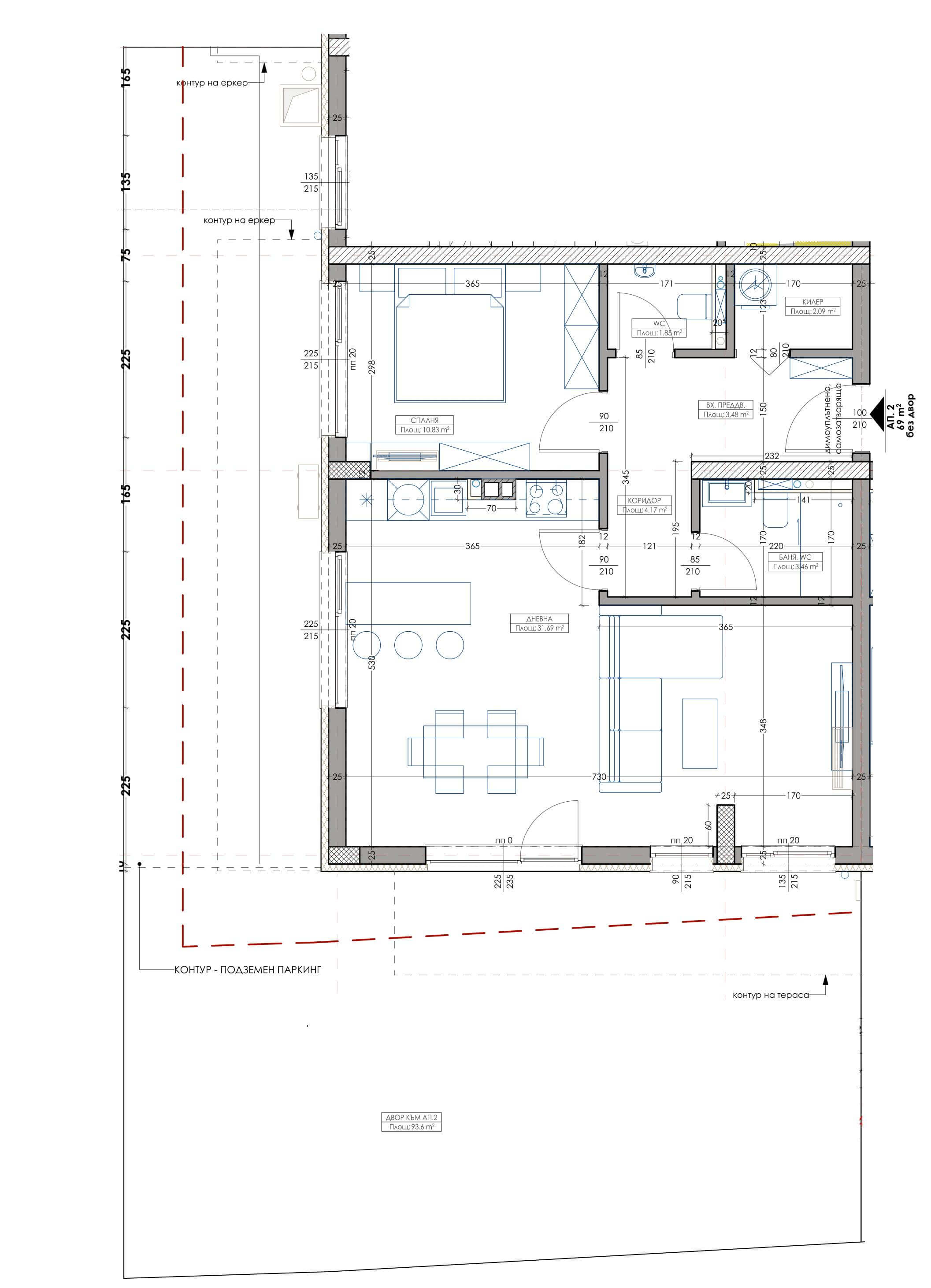 Апартамент – Дневна с кухненски бокс, спалня, баня с тоалетна, тоалетна, килер, входно преддверие, коридор. Имотът е с обща площ 81,57 кв.м, което включва 69,00 кв. м чиста площ и 12,57 кв.м общи части. Към апартамента е включен и двор 93,60 кв.м.